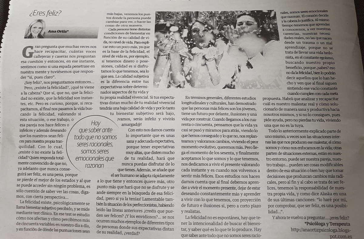 Ser terapeuta no fue algo que soñé de pequeña, más bien fue mi infelicidad la que me llevó a acudir a terapia. No me pasaba nada en especial, simplemente estando bien, no lo estaba. Mi proyección de vida, antes y después, fue totalmente opuesta, y doy las gracias cada día por ese momento en el que di el paso de ir a terapia. A medida que iba y para mi sorpresa, mi terapeuta me decía que debía dedicarme a esto. ¡Está loco! pensé, pero cuando empecé a sentir mi bienestar y a conocerme mejor, la idea que un día sembró empezó a tomar forma. Soñé con tener mi propia consulta y así hacer sentir a todo aquel que viniese la felicidad que había logrado hacer crecer en mi interior. Cada paso que damos y cada decisión que tomamos nos lleva a otra resolución de nuestra vida, ¿qué hubiese sido de mí si no hubiese ido a terapia?