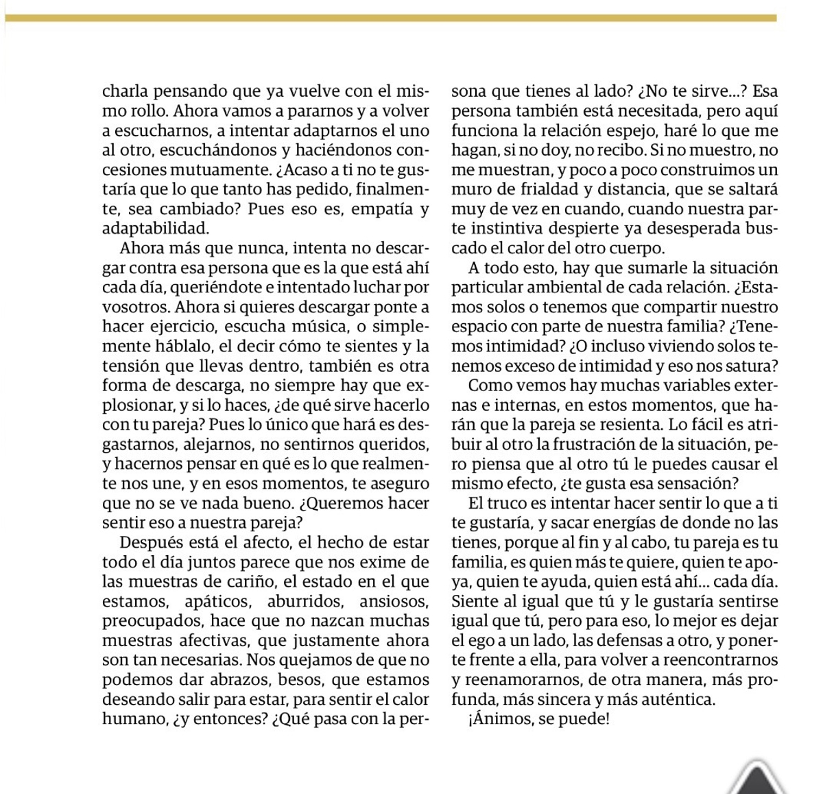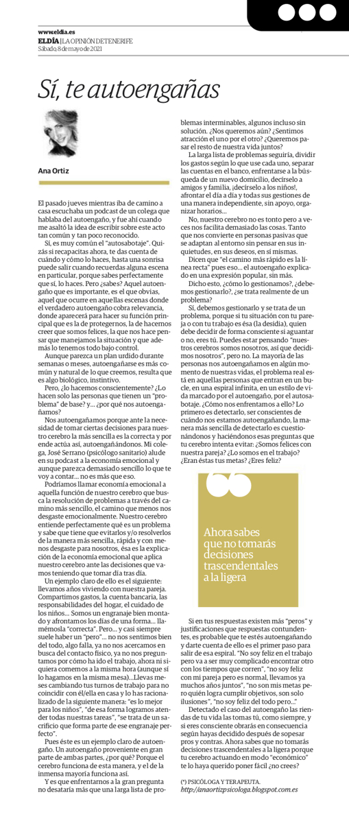 Podemos hablar de nuestra infancia, de la adolescencia, de la universidad, del trabajo, del amor, del sexo, incluso y, sobre todo, de las críticas que hemos recibido o nos hemos hecho. Al final, todo ello va haciendo mella en nuestra historia, y tristemente, nos ha llevado a esta situación.
