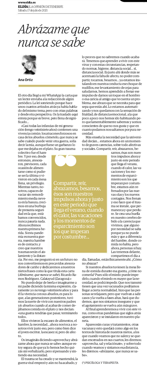 Mi trabajo a nivel individual me ha enseñado muchas cosas, y a nivel profesional muchas más. Crezco cada día con cada uno de mis pacientes, desde la humildad y desde el amor hacia ellos, intento por todos los medios que lleguen al bienestar, cuando estoy en terapia estoy en ellos y solo por ellos, escrudiño mi cabeza buscando las soluciones, a veces vienen solas, otras cuestan más, pero mi experiencia solo se puede resumir en “MARAVILLOSA” aunque eso, no exima de muchas emociones durante ella. Los pacientes se convierten en parte de mí y yo en parte de ellos. Vivo con ellos. Siento con ellos. Pero el final duele, porque implica separarme de algo muy mío, con la simultánea conciencia de que llegó el momento, de que los voy a extrañar: a extrañar-te. A extrañar-nos. Sufro un duelo, pero desde la serenidad y la felicidad de que somos algo muy íntimo, algo que perpetuará en la vida de cada uno. Tú has dejado algo en mí. Y yo he dejado algo en ti. ¿Se puede pedir algo más?.